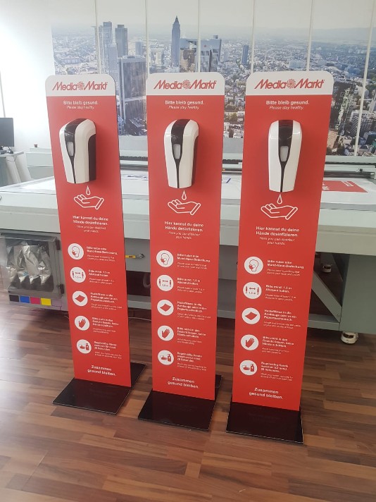 Diese Desinfektions-Station macht Werbung und dies zu einem fairen Preis.